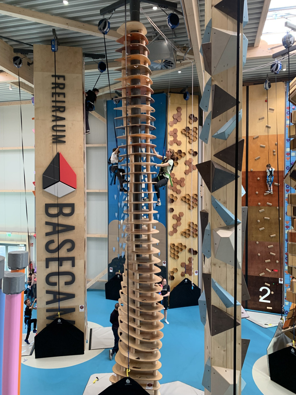 Das Herzstück des Basecamps ist die großzügige Kletterhalle mit über 1.400 m² Fläche. Hier trifft modernste Ausstattung auf kreatives Wanddesign: Beim Bouldern bewegen sich die Besucher auf zwei Ebenen ohne Seil, nah am Boden, aber mit viel Raum für Technik und Taktik. Wer höher hinaus will, kann im Sportkletterbereich an bis zu 21 Meter hohen Wänden im Toprope oder Vorstieg klettern – eine der höchsten Indoor-Wände Deutschlands. Und dann ist da noch der Funclimbing-Bereich: ein kunterbuntes Kletterabenteuer auf rund 400 m², mit 37 einzigartigen Elementen, die vor allem bei Familien, Kindergruppen und jung gebliebenen Erwachsenen für Begeisterung sorgen.