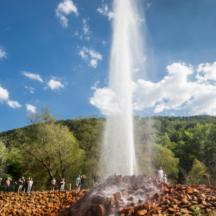 Anschließend geht es mit dem Schifftransfer zu einer etwa 2 Kilometer rheinabwärts gelegenen Halbinsel – einem Naturschutzgebiet und dem Ort des Geysirs. Nach einer kurzen Wartezeit lässt sich beobachten, wie die Fontäne aus Gas und Wasser erst langsam, dann immer stärker und schneller emporsteigt, bis zu einer Höhe von 60 Metern. Nach 15 Minuten ist der Ausbruch vorbei und das Schiff bringt alle wieder zurück zum Ausgangspunkt.