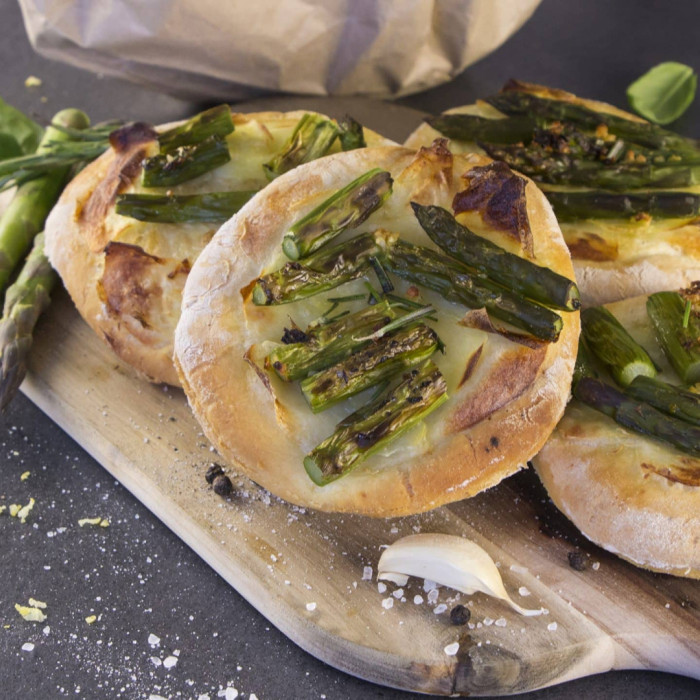 Die Arbeitsfläche bemehlen, den Teig noch einmal durchkneten und in 12 gleich große Kugeln teilen. Diese gleichmäßig zu kleinen Pizzaböden ausrollen, mit Kartoffelscheiben und Spargel belegen. Das Zitronen-Knoblauchöl darüber träufeln und nach Geschmack salzen und pfeffern. Die Pizzen 15 bis 20 Minuten backen, bis sie schön gebräunt sind, und mit frischem Rosmarin garniert servieren.